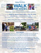The 3rd Annual Walk for Wishes North Idaho is a family-friendly fundraising event that celebrates past wishes granted while raising awareness and support for future wishes. This is our biggest fundraiser of the year. Funds raised at this event help grant wishes to North Idaho children battling critical illnesses.